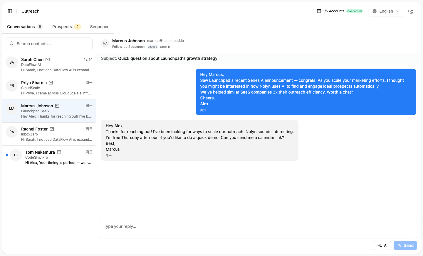 Nolyn replaced our SDR tool, email finder, and sequence tool — all in one platform. The AI reply drafts alone save us hours every week.